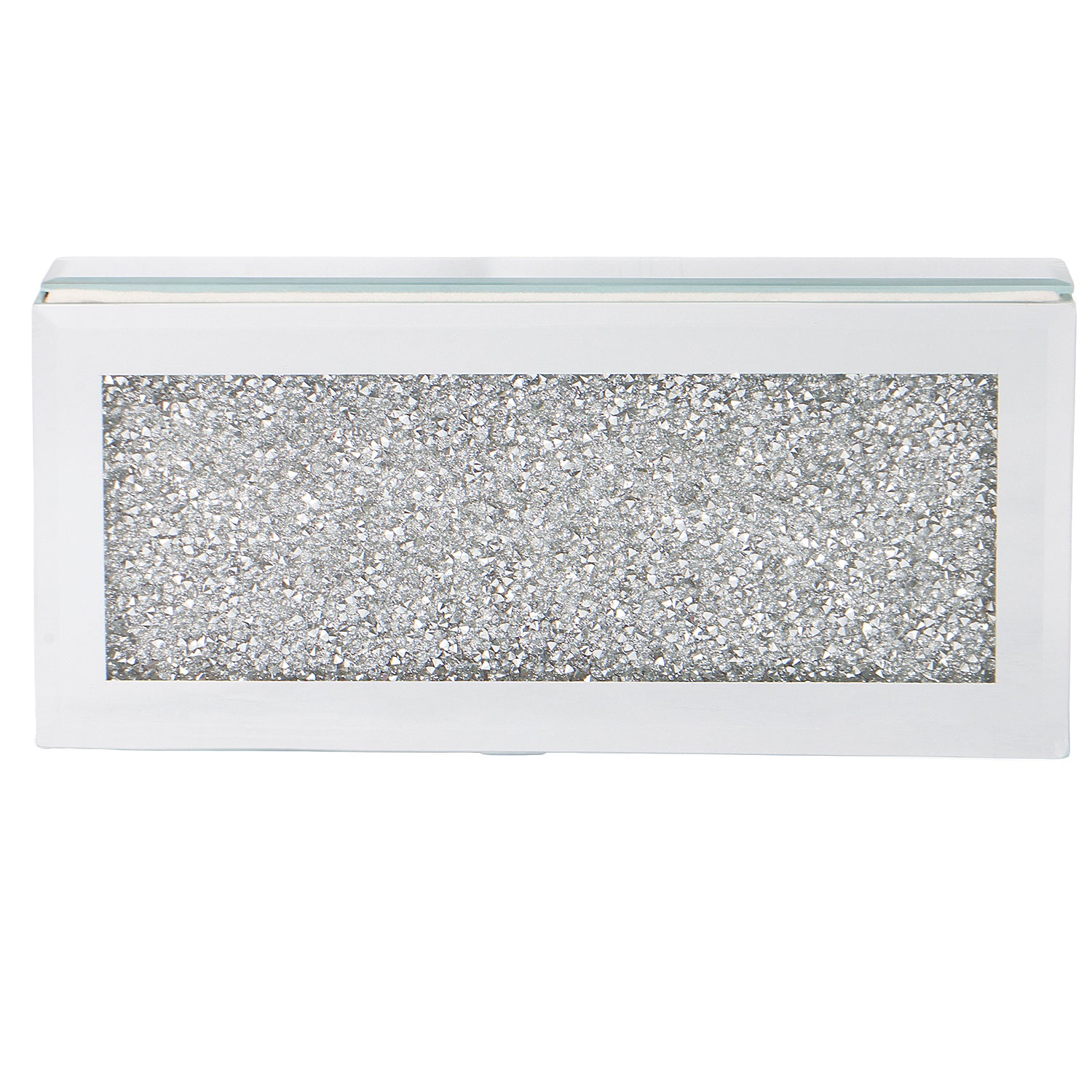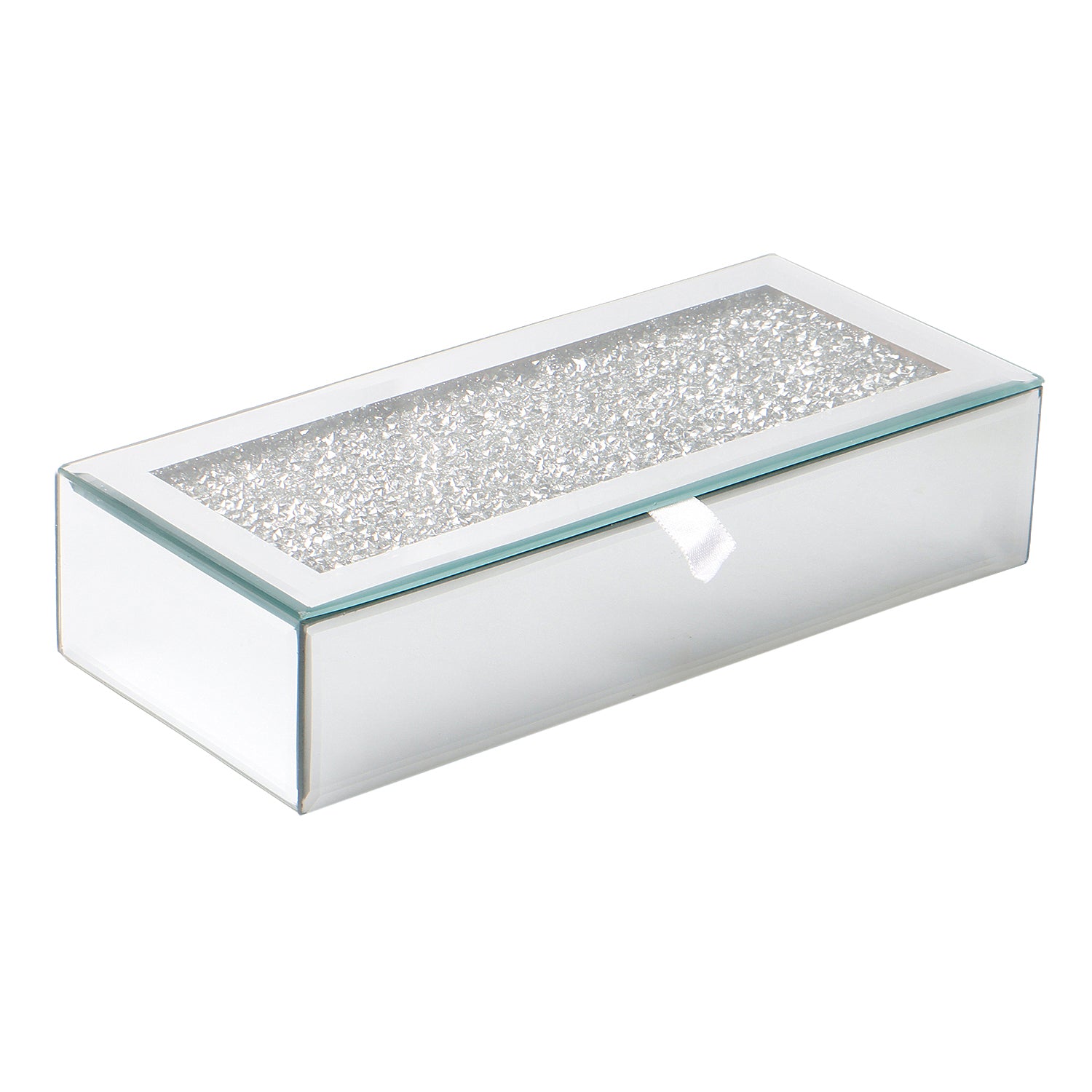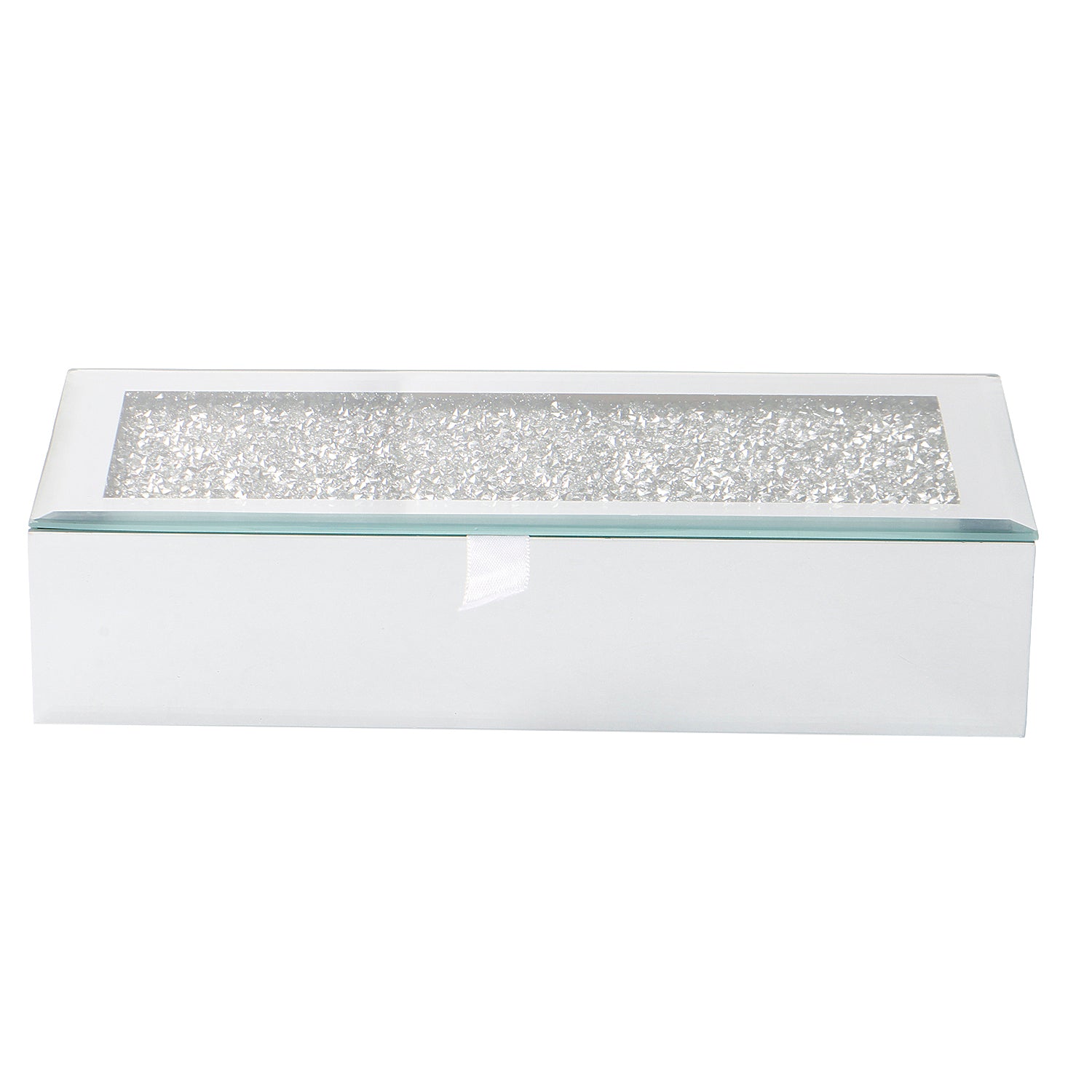 An elegant rectangular gift box crafted with a sleek white finish and a sparkling crystal-textured transparent lid. Designed to add a touch of luxury, it features a smooth pull-ribbon for easy opening—perfect for hampers, sweets, dry fruits, or special occasion gifting. Ideal for use as Wedding, Shagun, Returns Gift, Jewelry box or Other Festival Occasion. Can also be used as an elegant cash gift box for weddings, parties, birthdays, etc.